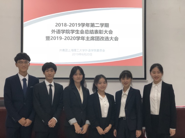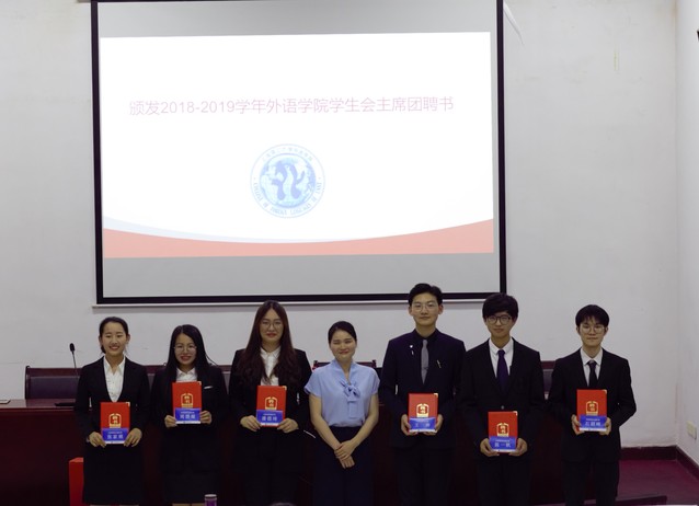 随后,本次大会的主题之一——表彰出色部长及部员。主席团的成员们为他们送上荣誉证书,由衷感谢各部门的成员们为外院学生会作出的无私付出,也希望大家能从这段在学生会工作的经历中学会更多、收获更多。在主席团换届改选前,18级的主席团成员们收到了由王木子老师亲手授予的聘书,他们是具有责任心和热情的外语力量