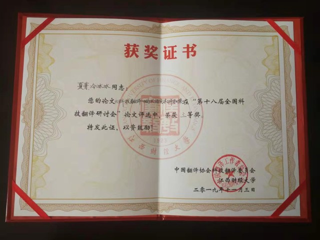 大会共设四个分论坛:分论坛一为机器翻译及其应用;分论坛二为科技和术语翻译;分论坛三为典籍翻译,分论坛四为实用文体翻译,大家就自己研究的领域进行了踊跃发言和热切讨论。必赢官网MTI导师冷冰冰副教授、邹建玲副教授及MTI研究生夏菁、张红参加了此次学术盛会。邹建玲副教授在分论坛四进行了题为“信、达、雅在翻译实践中的运用---以《简单规则》的英译汉为例”的论文宣读。冷冰冰副教授指导研究生夏菁同学和张红同学在分论坛二分别完成题为“科技翻译中的术语变体与译者对策”及“揭开术语变体山真面目---《术语变体研究的多元视角》介评”的论文宣读。在本次研讨会上,夏菁和冷冰冰副教授合作的论文“科技翻译中的术语变体与译者对策”在优秀论文评奖中荣获三等奖。