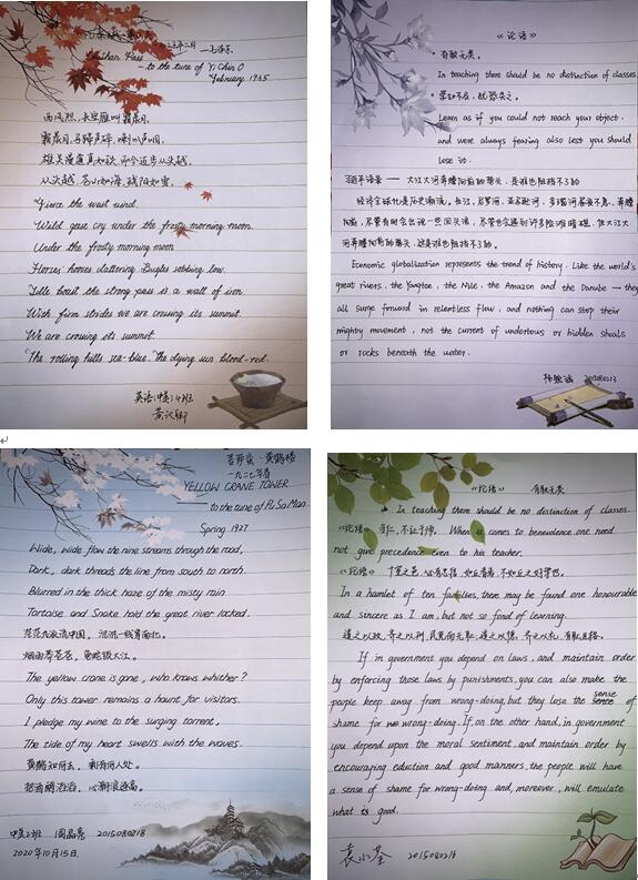 本次大赛的主题为“品鉴红色经典,书写自信芳华”,同学们分别在综合英语老师的指导下研读四史,诵读红色诗词,欣赏品鉴中国文化经典的英译本,并摘选其中的段落认真誊写在稿纸上。字体或磅礴大气,或清秀隽丽,浓浓的爱国情怀和民族自豪感,坚韧不拔的民族精神,叱诧风云的豪情壮志,都诉诸笔尖,跃然纸上。经过评委老师的集体评选,最终黄汉卿,杨煦涵,周晶亮,梅若萱,袁小荃等五位同学获得了本次比赛的一等奖;魏纪焜等十位同学获得了本次比赛的二等奖;李洋等二十五位同学获得了三等奖。
