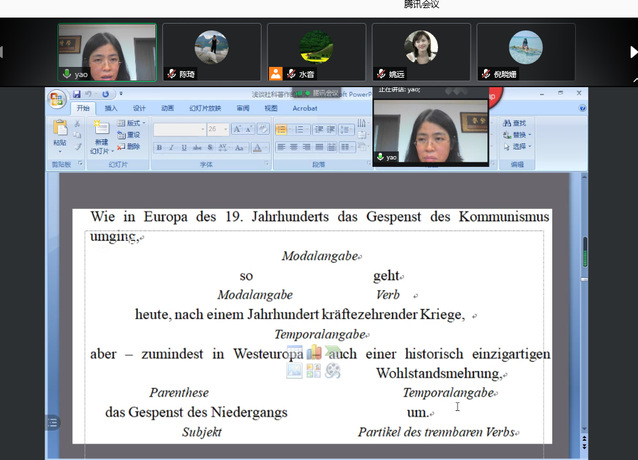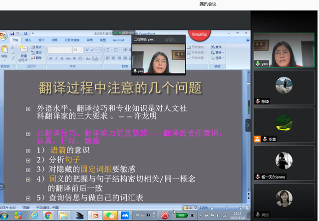 12月8日下午3点至5点,必赢3003no1线路检测中心德语系邀请到了北京外国语大学德语学院教授姚燕老师通过腾讯会议作了主题为“浅谈社科著作的翻译”的学术讲座。讲座由必赢3003no1线路检测中心副院长陈琦教授主持,德语系全体老师、MTI研究生以及部分本科学生参与讲座。