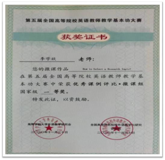 由高等学校大学外语教学研究会和全国高等师范院校外语教学与研究协作组共同主办的第五届全国高等院校英语教师教学基本功大赛评选工作圆满落幕。必赢官网公共英语教研中心教师李学欣的微课作品“How to Select a Research Topic?”从竞争激烈的众多参赛作品中脱颖而出,最终斩获2020年度优秀课例评比·微课组“国家级一等奖”。