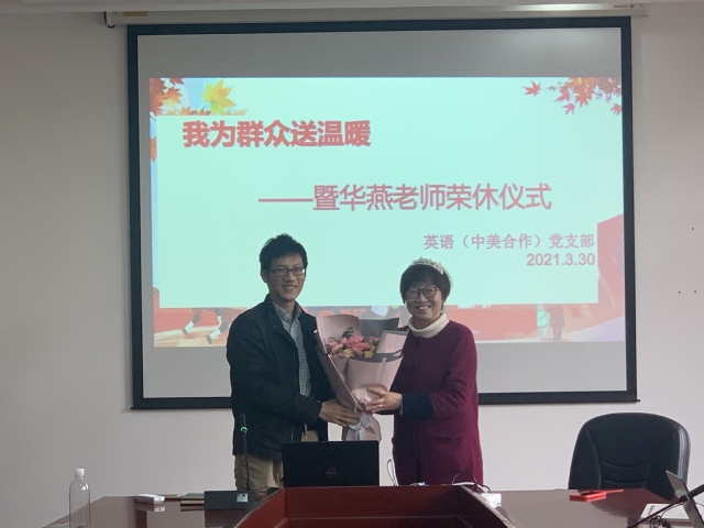 倾尽丹心育桃李,奉献韶华铸师魂。3月30日中午,必赢3003no1线路检测中心英语系(中美合作)党支部在外语楼306会议室举行了“我为群众送温暖——暨华燕老师荣休仪式”。会议由系主任黄芳老师主持,必赢3003no1线路检测中心副院长陈琦教授及全系教师参加了此次欢送会。
