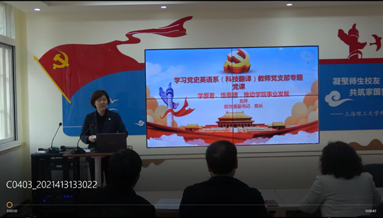党支部书记姜诚布置了目前党史学习教育的相关工作,要求全体党员和非党员教师积极响应党中央的号召,积极参加党史学习教育,鼓励非党员教师积极向党组织靠拢。会议还邀请学院党委副书记、院长刘芹同志为英语系教师做了题为“学原著、悟原理、推动学院事业发展”专题党课。她号召英语系全体教师从党史原著中汲取精神力量,继续推动学院事业发展。会议最后姜诚同志还就本支部年度党员发展工作和在上海市教卫党建公众号上要求党员完成相关活动做了布置,鼓励党员们带领群众积极参与纪念建党100周年活动,传承红色基因,更好地坚守初心使命、坚定理想信念。