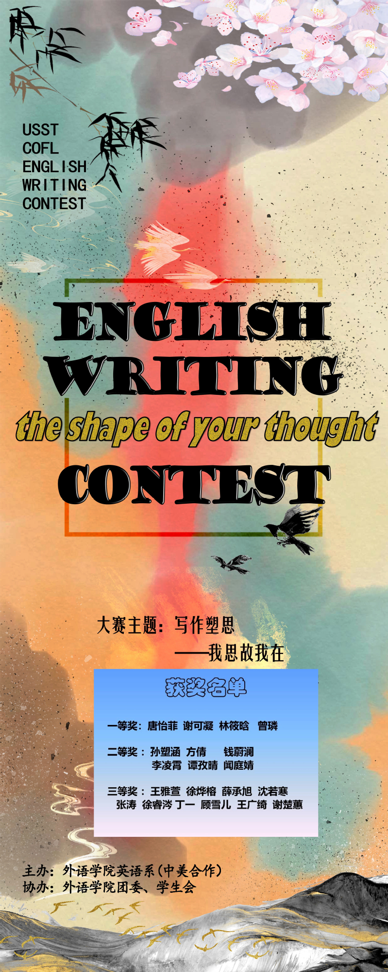 为充分展现课程思政的成果,英语系(中美合作)遵循以赛促学的原则,主办了写作大赛。本次大赛的主题为:“写作塑思—我思故我在”。参赛选手为2019级英语(中美合作)的全体同学。比赛分为两个环节:海选与决赛,最终产生获胜者。唐怡菲、谢可凝 、林筱晗 、曾璘等20位同学分获一、二、三等奖。在必赢3003no1线路检测中心的大力支持下,英语系(中美合作)师生们共同参与,比赛取得圆满成功。具体获奖名单请见如下海报: