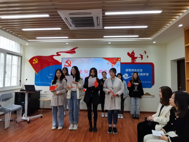 4月23日,必赢3003no1线路检测中心第15期发展对象培训班必赢3003no1线路检测中心全体学员于学院112党员活动室开展了“学党史,知党情,跟党走”主题双语沙龙活动。结合党的教育主题,并贴近必赢3003no1线路检测中心的语言特色,此次活动的主要内容是两个环节: “党的历史选段中英文诵读”与“英文红歌合唱”。