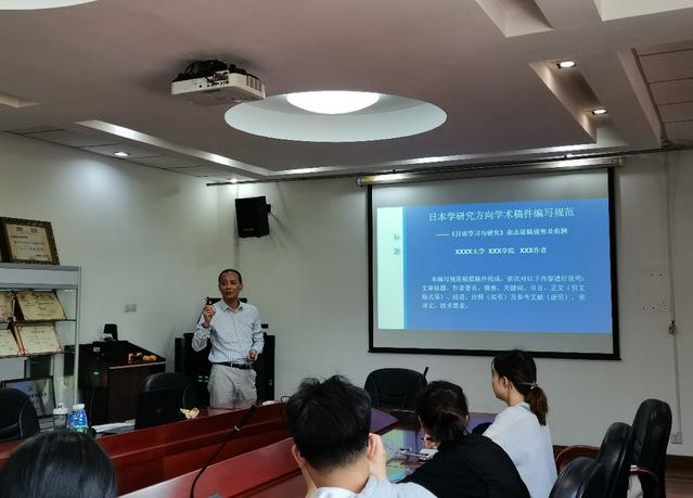 《日语学习与研究》是中国日语教学研究会会刊,也是我国日语学界唯一的南大核心期刊。李老师深耕杂志编辑多年,他从“标题”“摘要”“引言”“正文”“文献著录”“结语”论文各部分出发,详细指出了投稿发文时的常见错误,并给出了相应的指导意见。李老师特别指出,在日本学领域文稿编写过程中,引文编写不规范是文稿编写的重灾区;在正文写作过程中,时常出现中日文混合表达的情况,撰稿人应尽量使用中文表达等。另外,李老师还重点指出了撰写“文献著录”的注意事项。文献著录分为“注”与“参考文献”两个部分,容易被忽略,但是不符合规范的引用会造成错误引用,严重影响论文质量。他为在场的师生们解读了2015年颁布的《信息与文献参考文献著录规则》,并展示了大量实际案例。