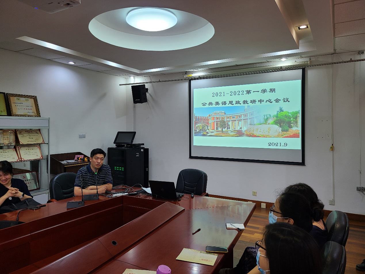 本次会议由公共英语教研中心主任、课程思政领航团队负责人张乐副教授主持。首先,马芫副主任对本科课程设置及教材调整作了详细说明,着重梳理了各门课程及教材中的思政内容,提醒任课老师在课堂教学、课后作业等环节有机融入思政元素,进一步推动部门的课程思政建设。随后,柏钧副主任对新学期分级考试的调整及考务工作作了详细的说明。接着,陈征副主任向各位老师介绍了新学期将使用的四大在线学习平台,明确平台学习在“阶段性、动态性、全程性”评价中发挥的重要作用,并重点介绍了各平台上可使用的丰富思政教学资源。随后,缪蓬副主任介绍了研究生公共英语课程改革的情况,以及新学期的授课安排。最后,张乐主任对本次会议进行总结,动员全体老师为新学期继续开展的“1+1+1”课程思政系列活动做好充分准备,并强调要将思政元素有机融入到教学的全过程。