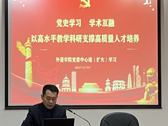 曲德强向前来指导工作的领导们表示热烈欢迎,并以新修订的《中华人民共和国教育法》为题进行了导学。他就新法修订的过程、意义、修订内容、贯彻落实等进行了详细的解读,并介绍了必赢3003no1线路检测中心党史学习教育的工作开展情况。他指出,学院党委通过党史学习教育,鼓励引导广大党员教师将党史学习和教学科研紧密结合,互融互促,切实把所学所悟转化为工作动能和发展成效。积极担负社会使命,在落实立德树人根本任务的基础上发挥专业优势,谋划推进课程思政、承担对外宣传,科研与党史理论深度互融,积极申报高水平科研基金项目,从“翻译世界”转向“翻译中国”。学院涌现了一批优秀团队和先进个人。这些学习成果一方面为教学积累了丰富的案例素材,另一方面也通过外语向世界讲述中国故事、传播中国声音,展示真实、立体、全面的中国,不断加强我国国际传播能力。