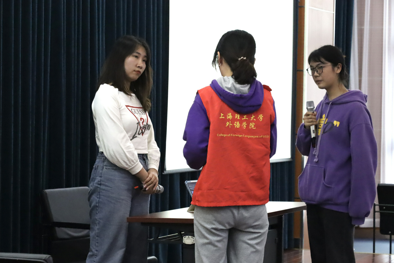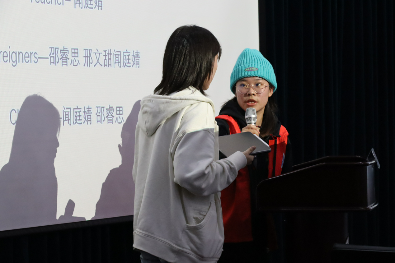 在本次活动中,主持人石浩男、顾雪儿和徐烨榕用中英文介绍节目,鲍彦荣、丁雪睿承担电脑音视频制作,陆思蓉、商静雯、涂子芊、赵舒梦和许丁芳计分发奖。这些志愿者们发扬了不求回报、热心为人的奉献精神。在每组节目结束后,往往还会有一个花絮小短片展示着各主题项目小组成员们的排练过程与同伴之间的互动,彰显团队精神。