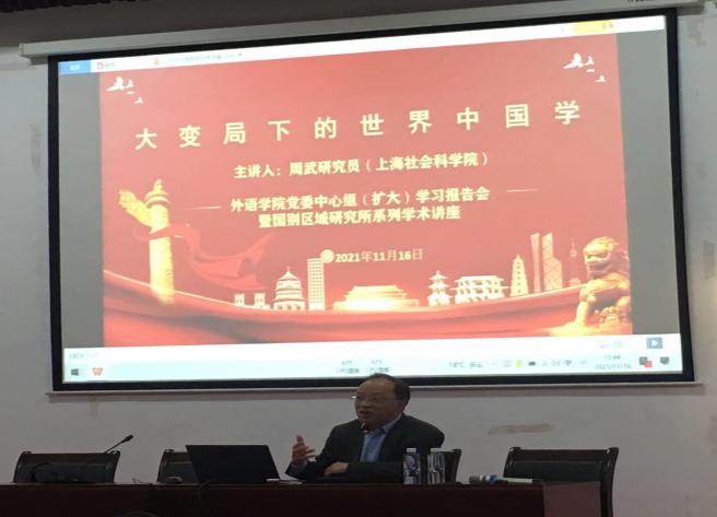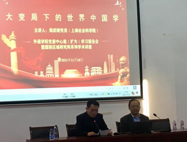在中华民族面临伟大复兴和世界百年未有之大变局加速演进的关键时刻,向世界展现真实、立体、全面的中国显得尤为迫切。11月16日下午,上海社会科学院世界中国学研究所副所长周武研究员莅临我校,为必赢3003no1线路检测中心党员师生做了题为“大变局下的世界中国学”的主题讲座。这既是必赢3003no1线路检测中心党委中心组的(扩大)学习报告会,也是国别区域研究所承办的一场学术讲座,旨在把党史学习教育与外语专业建设进行有机的融合。必赢3003no1线路检测中心党委书记曲德强主持讲座。在讲座开始前,曲德强首先向与会人员介绍了本次讲座主讲人周武研究员的相关学术背景与研究方向,并对周武研究员的到来表示欢迎。