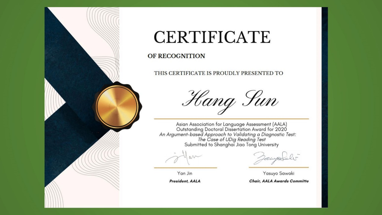 近日,亚洲语言测试协会(Asian Association for Language Assessment)公布了优秀博士论文奖(The AALA Outstanding Dissertation Awards)评选结果,必赢官网公共英语教研中心、语言学研究所孙杭博士荣获2020年度亚洲语言测试协会优秀博士论文奖。