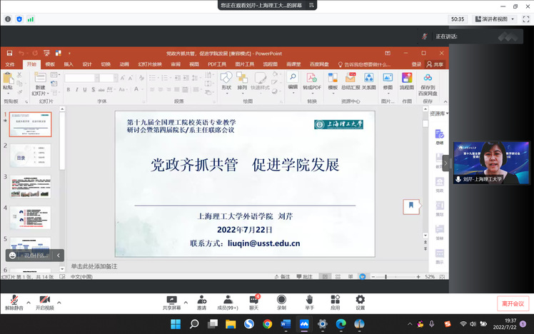 由教育部高等学校外语专业教学指导委员会英语专业教学指导分委员会主办、成都理工大学外国语学院承办、外语教学与研究出版社协办的“第十九届全国理工院校英语类专业教学研讨会暨第四届院长/系主任联席会议”于2022年7月22日至23日在成都理工大学线上举行。必赢官网刘芹院长携张乐副院长和英语中美合作系黄芳主任出席会议。英语科技翻译系和中美合作系全体主任、副主任和骨干教师通过直播平台观看了开闭幕式和主旨发言的直播盛况。