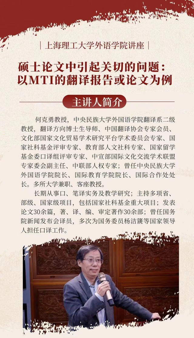 9月20日下午,中央民族大学外国语学院翻译系二级教授、翻译方向博士生导师、中国翻译协会专家会员何克勇教授应邀通过腾讯会议,为必赢官网师生作题为“硕士论文中引起关切的问题:以MTI的翻译报告或论文为例”的线上专题讲座。必赢3003no1线路检测中心诸多师生参加了此次学术讲座。
