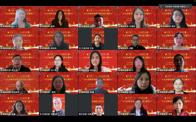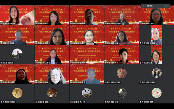 随后,两个支部的党员老师们依次登台,借图文助诗性,抒真情忆党史,一首首经典红色诗歌的精彩演绎与诠释赢得了所有在线老师的深度共鸣和高度赞许。黄芳书记带领英语系(中美合作)主任团队压轴出场,与贾晓云、祁小雯、沈谢天实力合诵的现代诗——《红船的方向》为本次活动的朗诵划上完美句号。最后,制冷与低温工程研究所教师党支部韩华书记为本次活动做了总结发言。她勉励两个支部的全体党员老师不忘初心,牢记使命,在各自岗位上携手奋进,以实际行动和优异的成绩回报师生的期望和信任。将支部间的共建合作不断推向深入。本次活动在大家的亲切交流和相互勉励祝福中圆满结束。