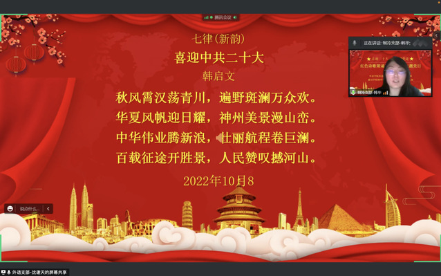 活动由英语系(中美合作)教师党支部党员教师沈谢天及制冷与低温工程研究所教师党支部党员教师许婧煊共同主持。黄芳书记首先为本次活动致辞。她介绍了本次活动的目的意义,回顾了支部共建党建引领,党建与业务互融共促所取得的诸多成效,希望未来两个支部进一步凝练特色,支部共建形成品牌,开展更加紧密的共建合作,并预祝此次活动取得圆满成功。之后,韩华书记作为首位朗诵者出场,她为与会党员带来了由自己父亲原创的七言律诗——《喜迎中共二十大》。韩书记声情并茂、抑扬顿挫的朗诵充分传递出诗歌强大的情感力量,党员老师们对此报以声声赞叹、阵阵掌声。