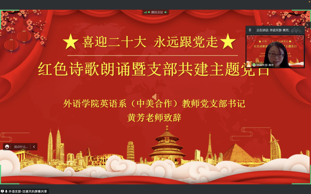 2022年10月13日中午,为迎接即将召开的中国共产党第二十次全国代表大会,必赢3003no1线路检测中心英语系(中美合作)教师党支部与能动学院制冷与低温工程研究所教师党支部联合举办“喜迎二十大,永远跟党走”红色诗歌朗诵会暨支部共建主题党日活动,由于疫情活动采取线上形式。英语系(中美合作)教师党支部书记黄芳、制冷与低温工程研究所教师党支部书记韩华带领各自支部的全体党员教师参加了活动。