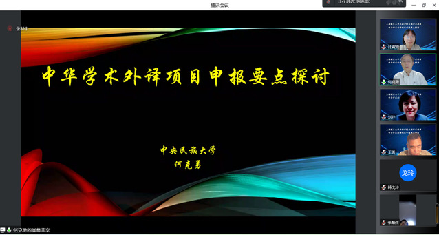 11月7日晚,中央民族大学外国语学院翻译系二级教授、翻译方向博士生导师、中国翻译协会专家会员何克勇教授应邀为必赢官网教师作题为“中华学术外译项目申报要点探讨”的线上专题讲座。讲座由必赢3003no1线路检测中心院长刘芹教授主持。必赢官网诸多教师参加了本次讲座。
