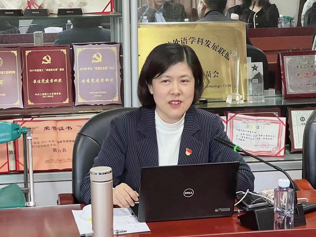 教师支部书记黄芳、学院团委书记王木子以及党员学生代表孙浣伲、胡家敏等分别做了交流发言。老师们表示,结合二十大报告的精神,通过开展支部活动和课程思政,推动党建和学术的互融,加强对学生对外传播意识与能力的培养,提升学生的专业水平和综合素质。党员学生代表孙浣伲谈到,作为外语学子,要努力练就过硬本领,用语言架起文化交流的桥梁,转变话语体系,用受众听得懂、感兴趣的表达方式,增强传播的吸引力,缩短与外国民众的心理距离。