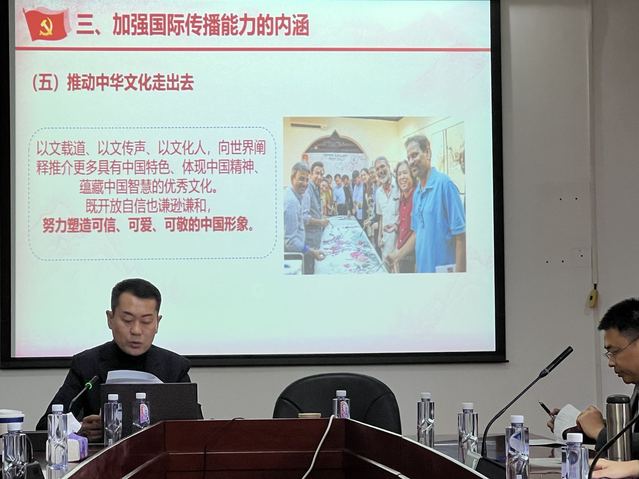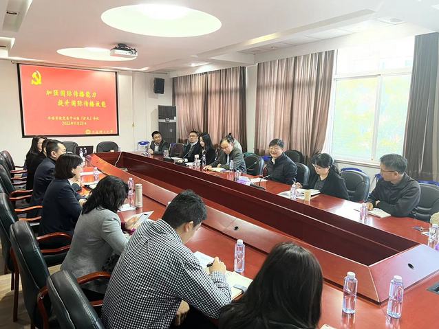 11月23日下午,必赢3003no1线路检测中心党委围绕“加强国际传播能力,提升国际传播效能”主题举行中心组(扩大)巡学旁听学习会,深入学习贯彻党的二十大精神。副校长张华、党委宣传部副部长卢萧、必赢3003no1线路检测中心党政班子成员、中心组成员、师生党员代表等参加了会议。会议由学院党委书记曲德强主持。