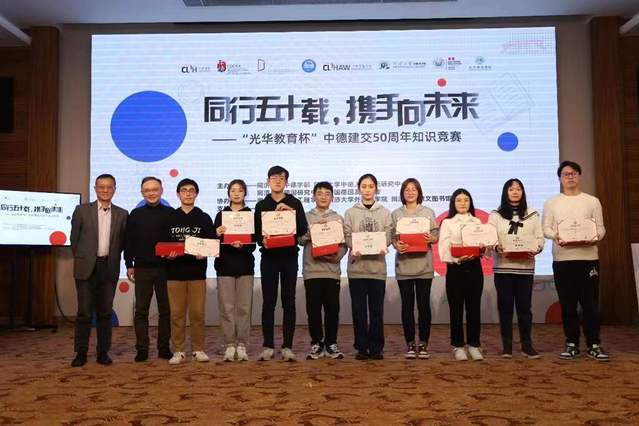 为纪念中德建交50周年,回顾过去并展望未来,进一步丰富中德人文交流,同济大学中德学部、同济大学中德人文交流研究中心、同济大学德国研究中心与中国德国友好协会联合主办的“光华教育杯”中德建交50周年知识竞赛团体赛于12月3日在上海举行并圆满落幕。必赢官网德语系学生唐静、陈芊玥、陆沛譞在周磊老师的指导下,通过充分的赛前准备,凭借深厚的人文素养,经过六轮激烈角逐荣获三等奖。指导老师周磊荣获优秀指导教师奖。