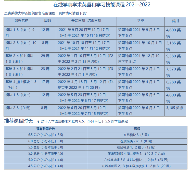 其他同等英语语言能力证明文件亦可(如大学英语6级,具体可咨询65679165曹老师),但需参加思克莱德大学组织的前期英语语言班(根据上课时间费用不等,具体见下表)。
