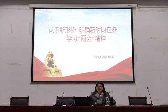 仇发华通过对“认识当前新形势的复杂变化”“政府工作报告的内容及过去的工作回顾”“未来的工作任务”三个方面的阐述,系统深入地传达了全国两会精神。她就世界经济发展面临的困难、大国博弈及地缘政治冲突、国内经济发展面临困难等问题进行了深入的分析;同与会师生一同回顾了2022年面对风高浪急的国际环境和艰巨繁重的国内改革发展稳定任务,以习近平同志为核心的党中央团结带领全国各族人民迎难而上,实现了经济平稳运行、发展质量稳步提升、社会大局保持稳定,取得了来之极为不易的新成就;她还介绍了新一年国家在民族、宗教、侨务、国防、外交等方面的重点工作。通过仇教授详尽的讲解,师生们对全国两会精神有了更加深刻而全面的认识。