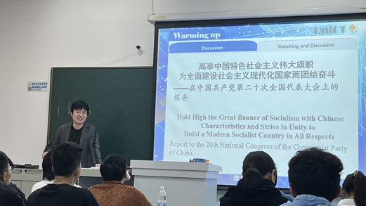 3月10日,缪蓬老师在军工路1100号校区申二教407教室开设《学术英语读写》公开课。课上,缪老师以选自二十大报告的句子“互联网上网人数达十亿三千万人”引出本次授课的主题“互联网+”,对相关基本概念加以介绍,并利用二十大报告文本中有关“网络安全”“网络强国”等表述的句子,以汉译英填空练习的形式,加深学生对相关词汇的掌握。其后,对中国关键词“Internet Plus Plan of Action”加以介绍,并提出三个有关学生在学习、生活中使用互联网的思考题,组织小组讨论,引导学生对相关问题进行深入思考。次日,到场听课的老师就如何将思政元素有机融入学术英语教学展开研讨。