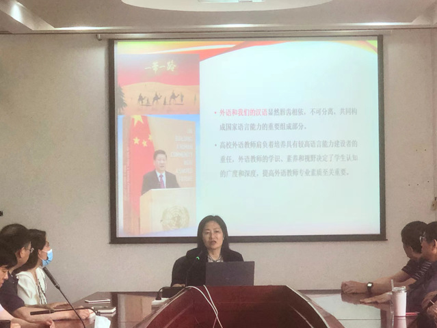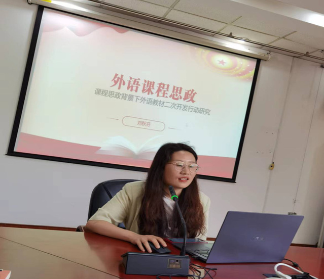 随后,邬菊艳和刘秋芬两位老师分享了自己课程思政教学和教研的感悟与心得。邬老师主要从如何将母语汉语和中华文化有机融入英语专业知识教学方面进行了感悟分享;刘老师则根据她自己的课程思政教研成果“外语教材二次开发行动研究”进行了较为深入地交流,两位老师的分享与交流给在座老师今后落实课程思政教学和教研提供了很好的、可供借鉴的经验,受益匪浅。