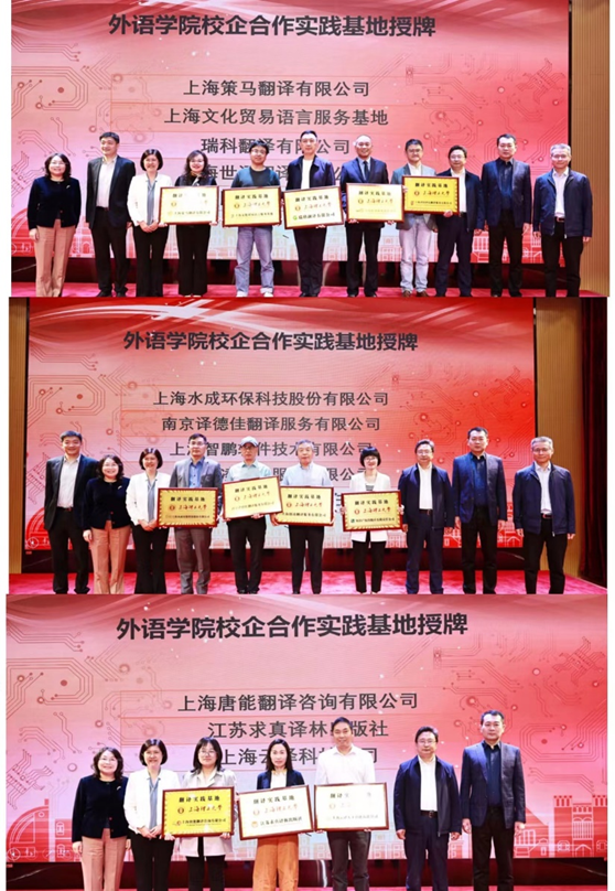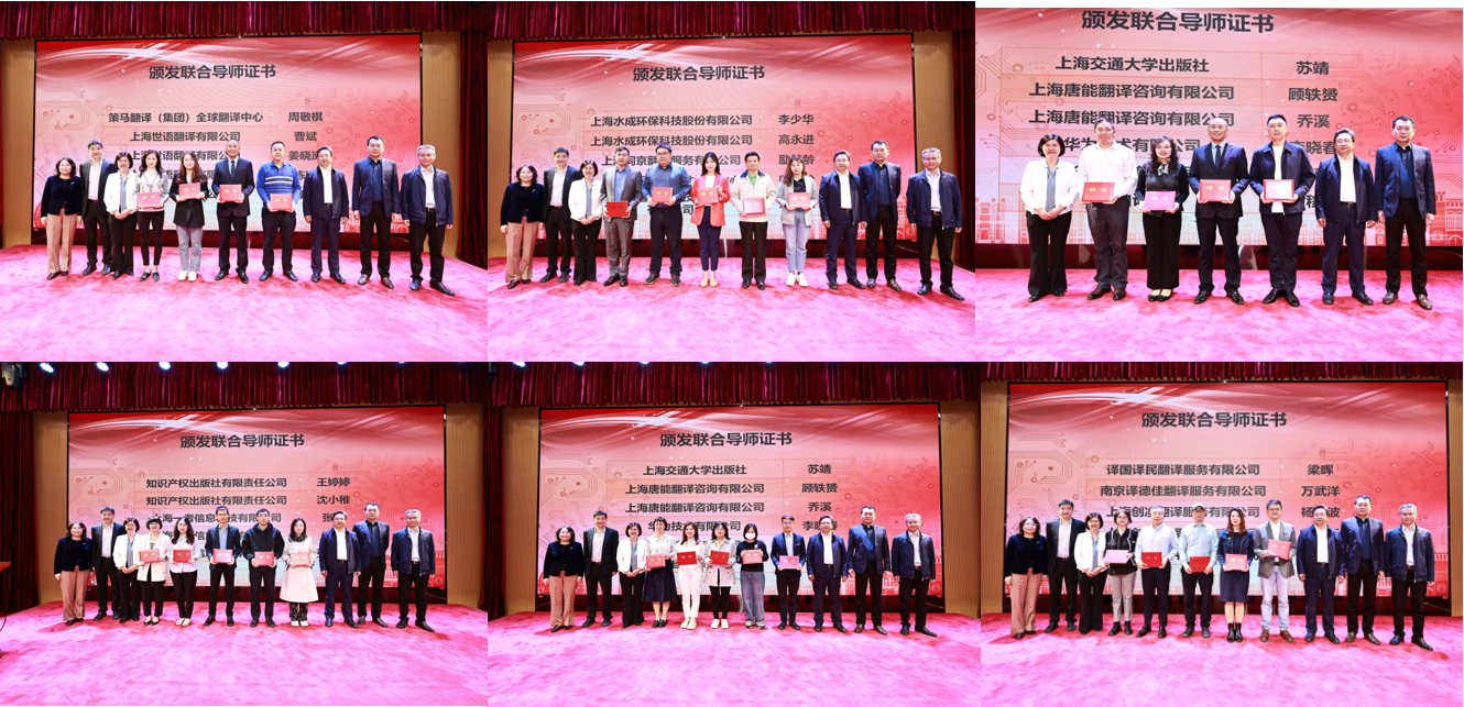 接下来举行了校企合作翻译实践基地举行授牌仪式,与会领导依次为13家MTI实践基地进行授牌,并为出席会议的33位校外联合导师颁发证书。