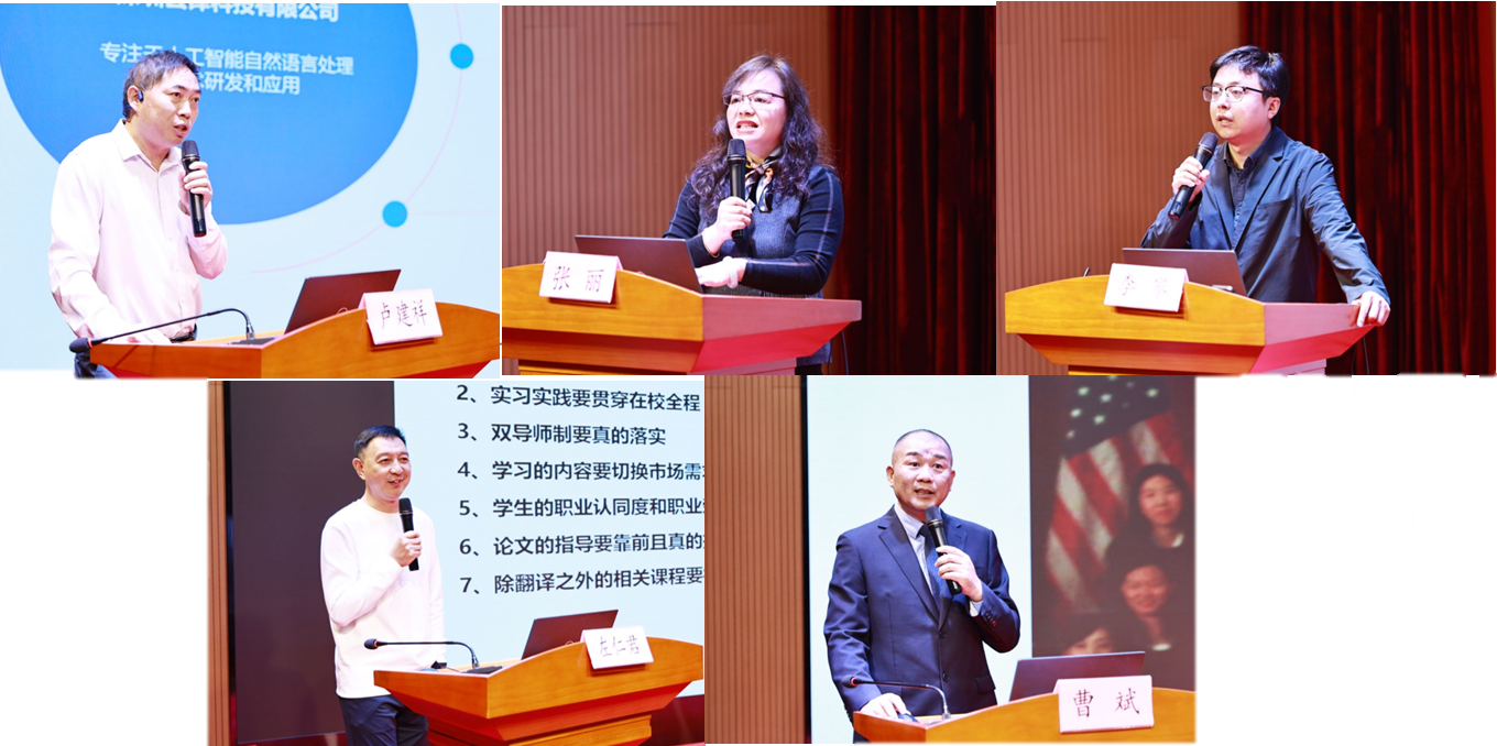 语言服务企业联合导师代表做主旨报告,上海云译科技公司卢建祥总经理、上海策马翻译有限公司张丽总经理、上海文策翻译有限公司李攀经理、瑞科翻译有限公司左仁君总经理、上海世语翻译有限公司曹斌董事长分别就人工智能技术发展对于翻译专业以及行业带来的挑战和校企合作前景做主旨发言。卢建祥总经理以“人工智能技术与翻译人才培训”为题,结合生动形象的例子,介绍云译科技公司的大语言模型及框架,分享自然语言处理技术应用于人工智能软件教学的经验,从笔译、口译及实训平台等方面展示了人才市场的需求及大数据发展前景。张丽总经理以“策马产教融合进校园”为题,介绍策马翻译公司在促进产教融合、协同育人方面的最新探索成果——“实习-就业双核体系”,致力于解决翻译市场需求与人才供给不匹配的问题,鼓励同学们积极参与策马翻译公司实习项目。李攀经理以“语言服务产业概况与人才需求”为题,围绕语言服务行业,简要介绍职业译员发展历程,翻译行业岗位需求现状及人才需求趋势,为翻译专业研究生的培养方向提出建议。左仁君总经理以“关于翻译公司开展校企合作的系列思考”为题,从企业角度为培养提出翻译硕士实习实践贯穿全程、有效落实双导师制、优化翻译硕士培养方案等7点建议,探讨校企合作的共赢效益。曹斌董事长以“校企合作实践基地成果与展望”为题,介绍中国翻译及语言服务行业的发展,上海世语翻译公司多年来秉持“以赛促学、以赛促训、精诚合作、携手与共”的原则与必赢3003no1线路检测中心开展多项合作,是校企合作的优秀典范。