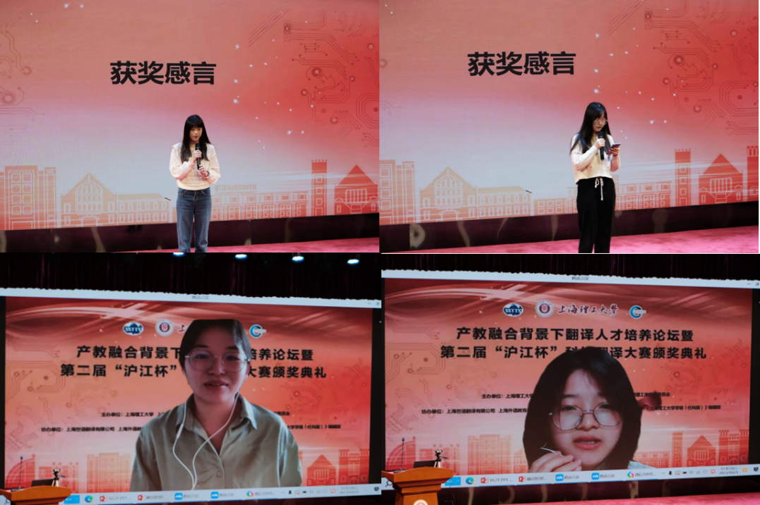 来自华东理工大学、河南大学、上海外国语大学和我校的四位一等奖获奖学生发表感言。我校李沁瑶同学表示,“沪江杯”科技翻译大赛为在校学生提供了一个成果展示、交流互鉴的平台,这次获奖是对她翻译学习的一个肯定和鼓励,她将在今后的学习生涯中继续努力提升翻译水平,为中德文化交流做出更多的贡献。