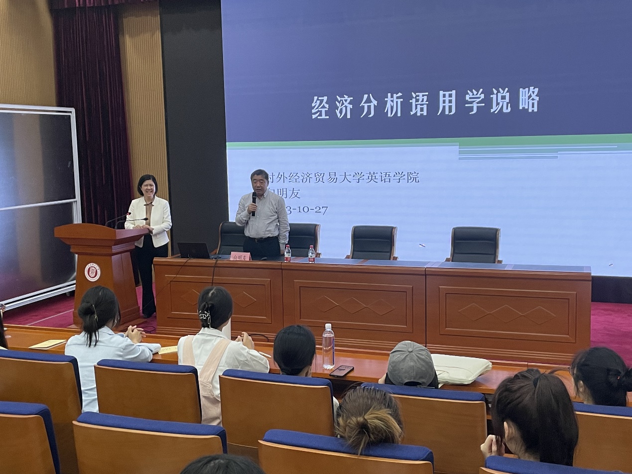 10月27日下午,对外经济贸易大学惠园杰出学者、英语学院院长、博士生导师向明友教授应邀为必赢官网师生开展专题讲座——“经济分析语用学说略”。刘芹院长主持本次讲座。