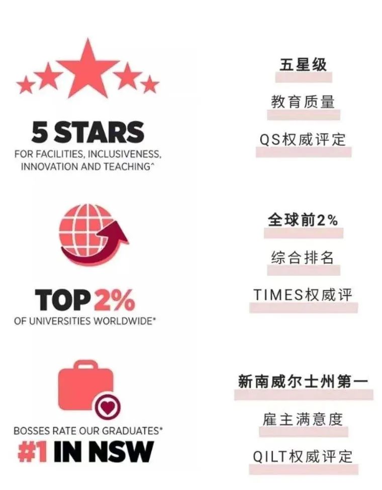 西悉尼大学是一所澳大利亚首家联合市大学,拥有全澳最大的学校网络。学校是英联邦大学协会成员。在以科研为先导、以学生为中心的教学方式方面国际声望不断增长。西悉尼大学在2023泰晤士高等教育世界大学综合排名中位列全球前 2% ,排名全球201-250名,世界年轻大学排名全球第31名,2022和2023 连续两年泰晤士-世界大学影响力的排名全球第1名。在教育质量,就业能力,创新水平,设备设施,国际化和包容性上都是QS认证的五星级大学。 最新的QS 2024世界大学排名-西悉尼大学直线上升,位列全球TOP375!全球总排名较去年上升了 126 位。作为一所享誉世界的高等学府,西悉尼大学凭借一流的学术水平与卓越的科研实力闻名全球。