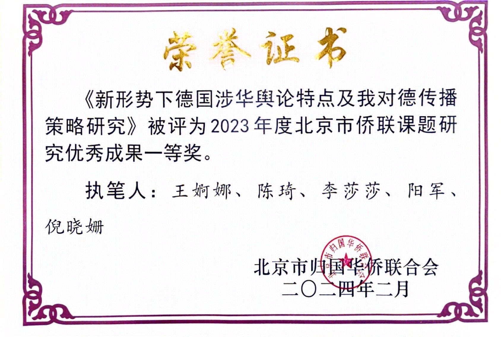 必赢官网德语学科负责人王婀娜教授荣获“2023年度北京市侨联系统信息工作——先进个人”荣誉称号。她的研究成果紧密围绕侨联工作实际,响应国家中心大局,为中央和市委科学决策提供了重要参考。