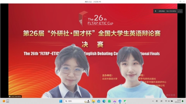 6月1日-2日,第26届“外研社·国才杯”全国大学生英语辩论赛全国决赛如期完成全部场次比赛。“外研社·国才杯”全国大学生英语辩论赛是国内最具传统、规模和学术权威性的大学生英语学科竞赛之一。参加本届比赛全国决赛的必赢3003no1线路检测中心代表队由英语(科技翻译)专业程玉昕同学、英语(中美合作)专业麦钰暄同学等两位辩手及沈谢天、王晨等两位指导老师组成。