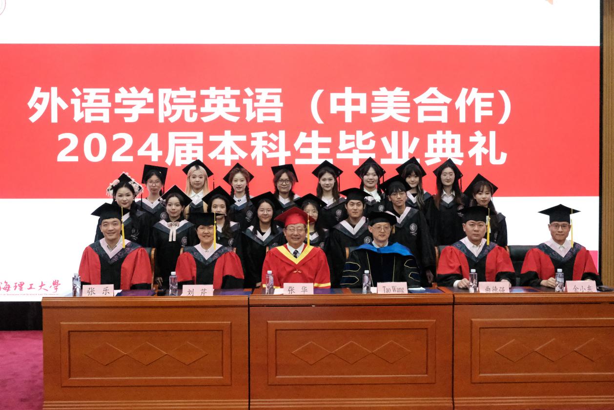 毕业典礼在雄壮的国歌声中拉开序幕。首先,张华副校长致辞,他回顾了英语(中美合作)专业的发展历程,向为合作项目付出辛勤努力的中美双方老师表示衷心的感谢,向各位毕业生同学表示由衷的祝贺,希望全体毕业生牢记“信义勤爱、思学志远”校训,努力工作,积极向上,奋发有为,在今后的人生旅程中书写新的壮美篇章。