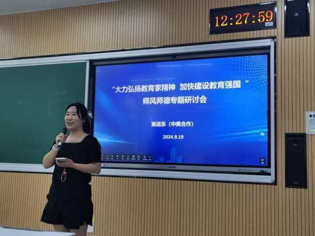 9月19日中午,英语系(中美合作)在四教107教室召开以“大力弘扬教育家精神,加快建设教育强国”为主题的师德师风专题研讨会。此次会议是系部为庆祝中华人民共和国第40个教师节组织的专项研讨活动。会议由系主任黄芳主持,英语系(中美合作)全体教师参会,赵美欧、毕一飞两位年轻骨干教师作了有关师德师风方面的主题分享。
