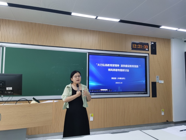 赵美欧老师首先以“风潮”与“风格”为关键词阐释“师风”在当代高等教育语境下的崭新内涵。她认为,高校教师应时刻把握学术风潮前锋,当好青年学子发展与成长过程中的指导者和领航员,要着力打造符合个人治学特色的独到教学风格,在课堂上找准施教切入点,适时以自己在本研究领域内的最新发现与成果启迪学生进行更深入的学科探索。同时要注重课程思政建设和价值取向的引领,将思政元素有机地融入课程教学,达到润物细无声的效果。