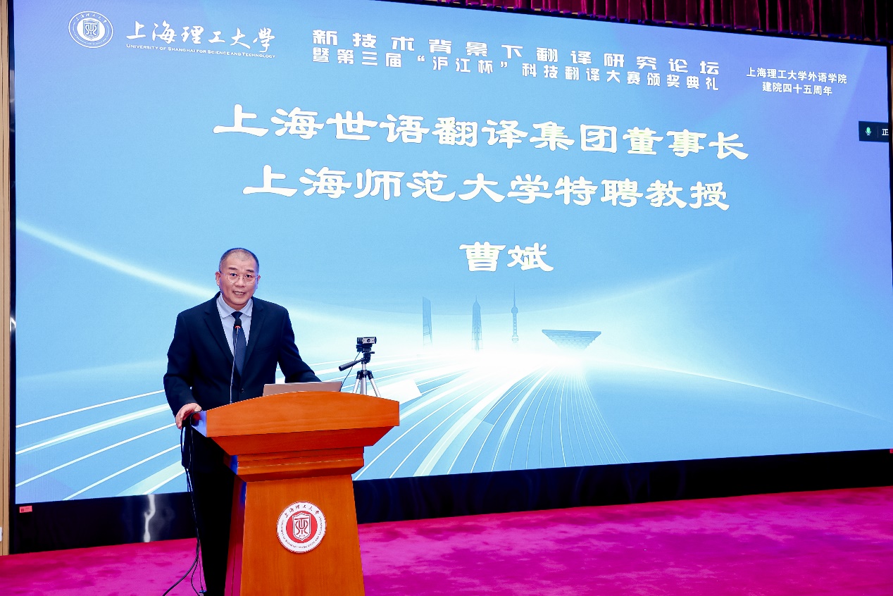 杨俊峰教授代表大赛组委会致辞。他指出,“沪江杯”翻译大赛为致力于科技翻译实践的学子们提供了宝贵的学习和提升机会,促进科技翻译教学的深层次和高水平的发展。他认为科技类翻译大赛有助于促进科技成果转化,推动科技国际合作,带动外语教学发展,推动翻译人才培养质量提升,在促进科技创新、跨文化交流和信息传播等方面发挥着至关重要的作用。上海世语翻译集团董事长、上海师范大学特聘教授曹斌代表承办方感谢各方对“沪江杯”科技翻译大赛的支持和贡献,生动地解说 “沪江杯”大赛名称的渊源,介绍举办高水平全国翻译大赛的经验和影响力,对明年的“沪江杯”翻译大赛给予美好祝愿。最后,必赢3003no1线路检测中心副院长韩戈玲教授致谢,带领必赢3003no1线路检测中心MTI教育中心王勇和杨本明教授向参与大赛工作的所有人员表示真诚感谢!至此,“新技术背景下翻译研究论坛暨第三届‘沪江杯’科技翻译大赛”圆满落幕,期待2025年第四届“沪江杯”展现新面貌、新动力。