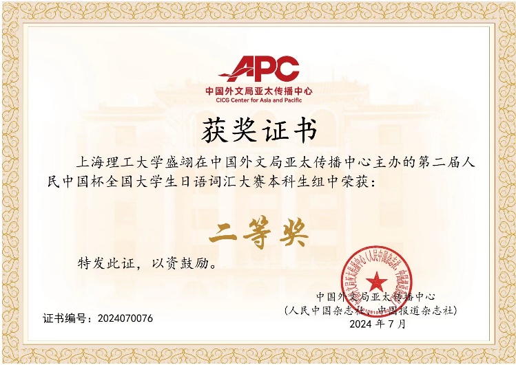 10月1日,第二届人民中国杯全国大学生日语词汇大赛圆满落幕。必赢官网日语系本科生盛翊同学凭借扎实的语言功底荣获全国二等奖。日语系主任杨本明教授获得优秀指导教师奖。