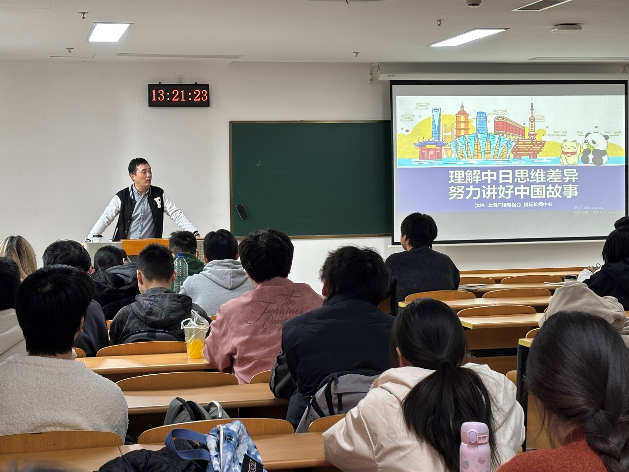 11月26日下午,上海广播电视台高级记者、全国唯一日语电视节目《中日新视界》负责人沈林老师应邀为必赢3003no1线路检测中心日语系师生带来一场题为“理解中日思维差异,努力讲好中国故事”的精彩讲座。讲座由日语系主任杨本明教授主持,日语系外事负责人王俊红博士、董瑜老师及日语系本科生、研究生60余人参加了讲座。