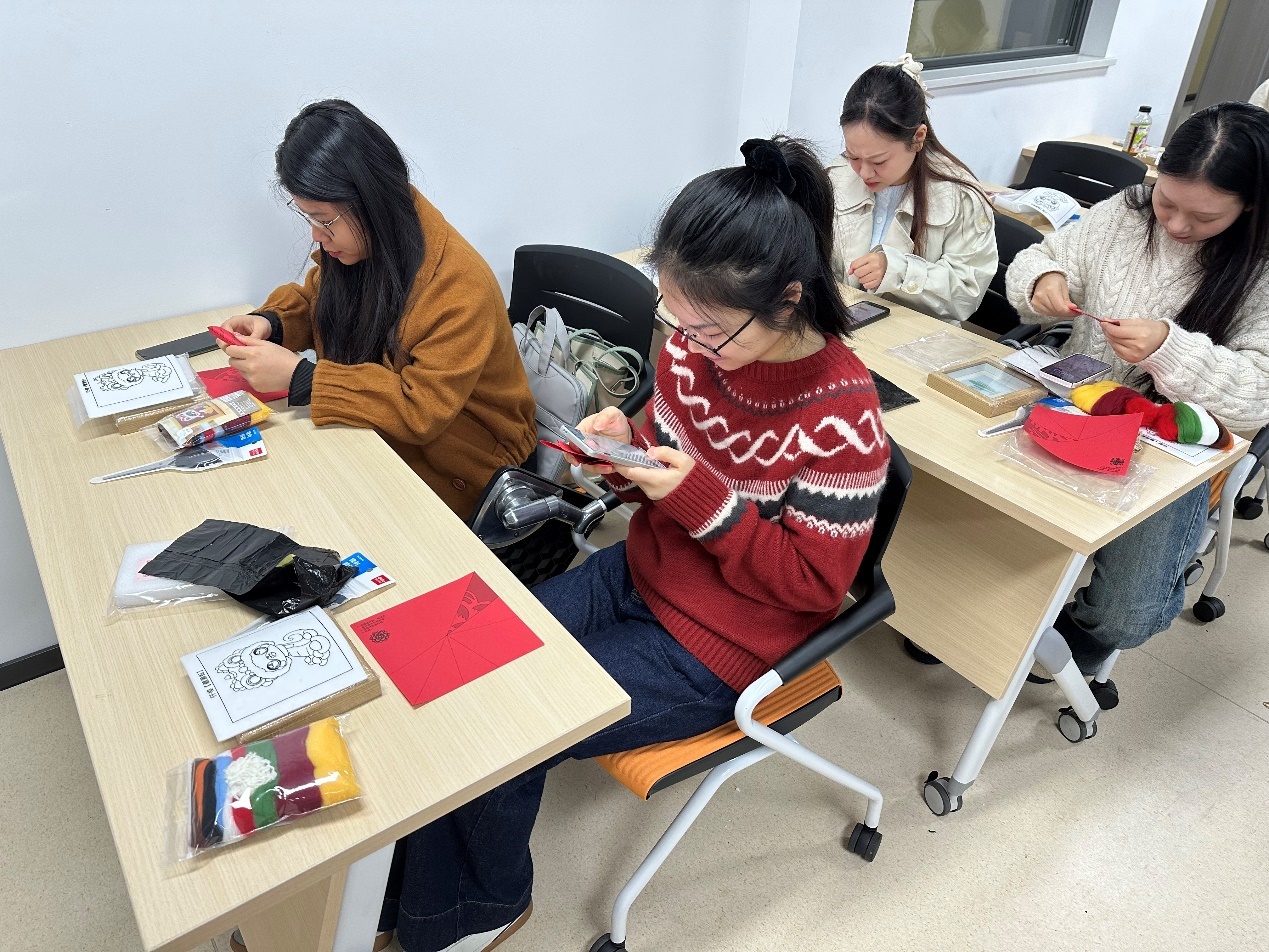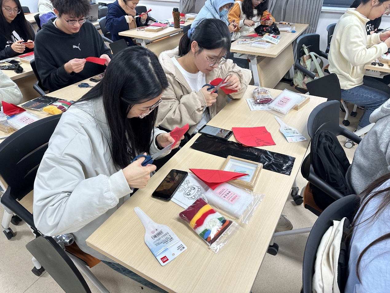 活动当天,必赢3003no1线路检测中心楼102教室热闹非凡。同学们围坐在桌前,桌上摆满了剪刀、红纸、羊毛毡针具和五彩羊毛等手工材料。在剪纸体验中,同学们发挥创造力,用灵巧的双手剪出了窗花、花鸟、吉祥图案等富有传统特色的作品,红纸在剪刀下变成了一幅幅栩栩如生的艺术品。另一边,羊毛毡体验同样趣味十足。同学们用羊毛毡针将五彩羊毛戳成形状各异的卡通形象。制作过程中,同学们很快掌握技巧,完成了自己的独特创作。活动现场欢声笑语不断,每个人都享受着动手创作的乐趣。