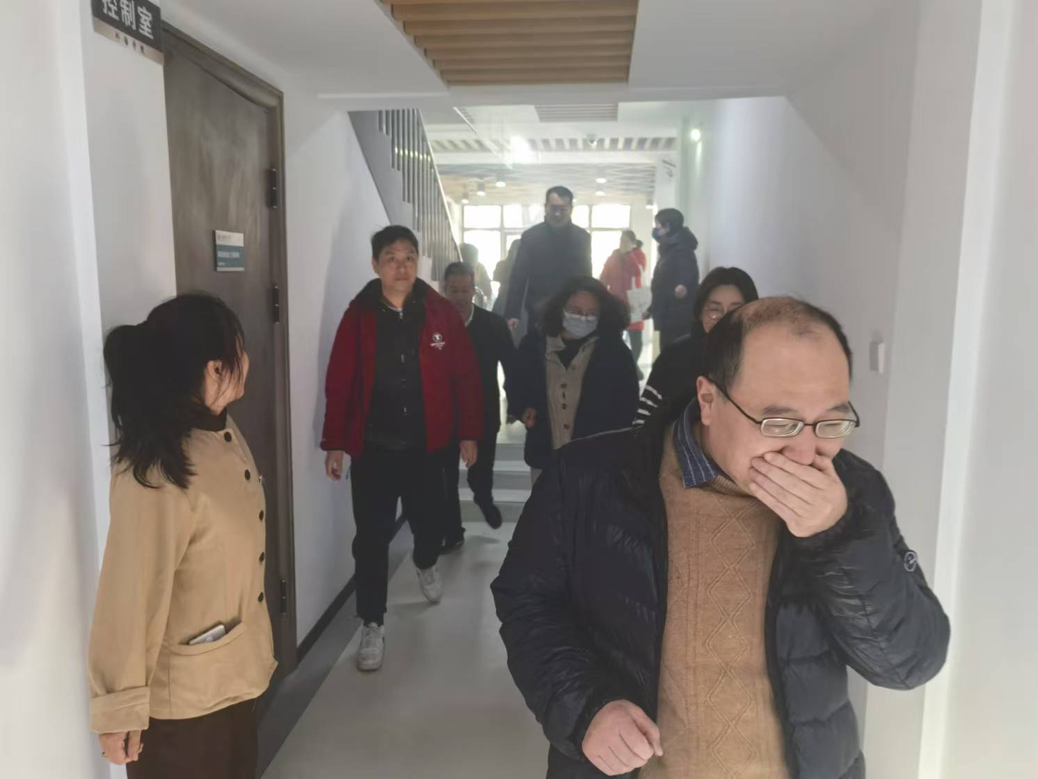 上午10点,大楼火警响起,相关老师立即拨打电话报告学校保卫处,并模拟拨打119火警电话。师生们在引导下通过楼道常闭防火门有序疏散。5分钟后,人员疏散完毕,参演师生集合于楼外空地处并清点人数。保卫处人员及时到位,模拟扑灭火灾。
