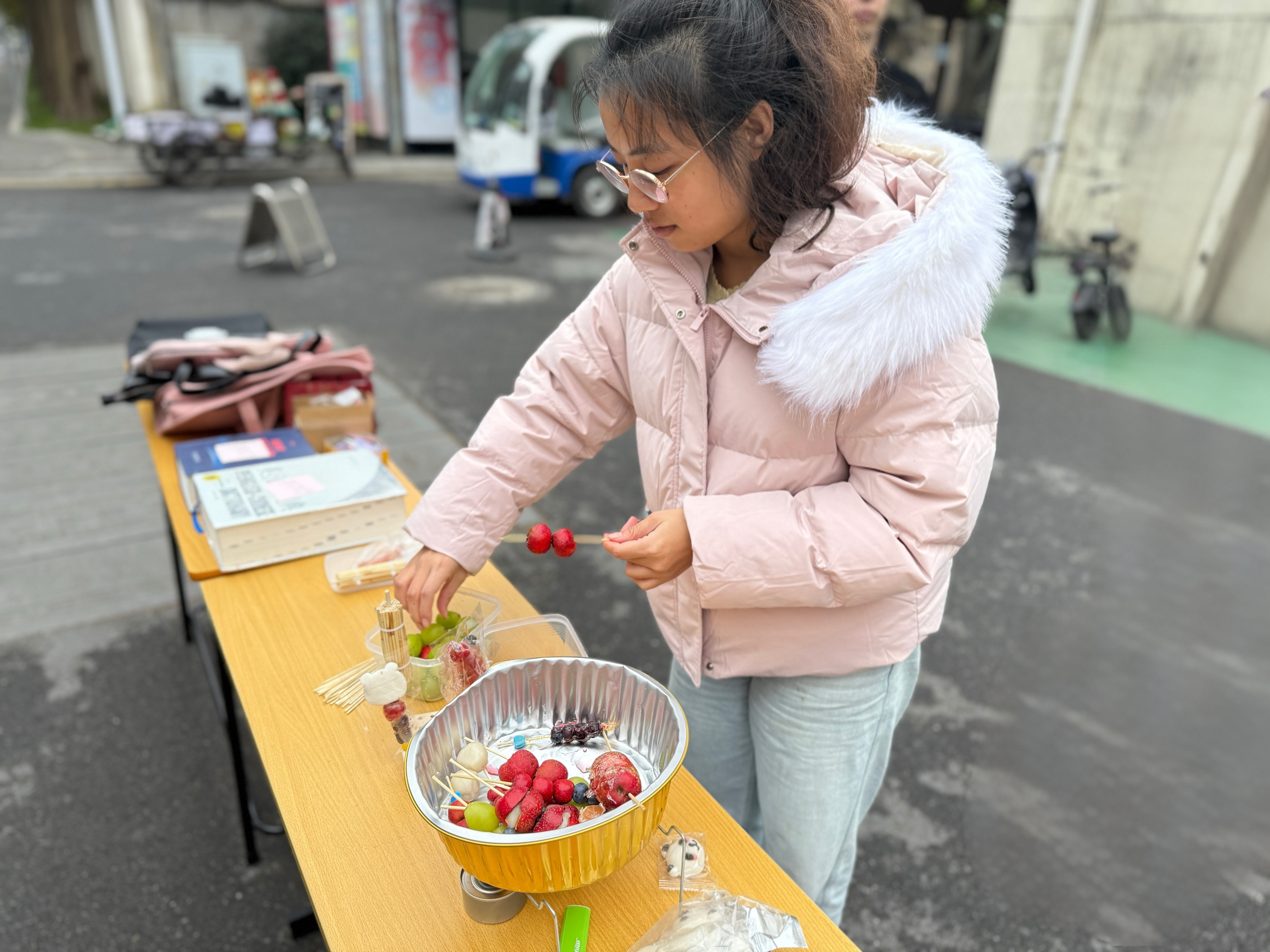 特别引人注目的是一位糖葫芦摊主,她的摊位不仅为现场带来一抹甜蜜的色彩,还巧妙地将传统美食与现代活动相结合,吸引了不少师生驻足品尝。糖葫芦的甜美滋味和浓浓的艺术氛围交织在一起,成为活动中一道独特的风景线。