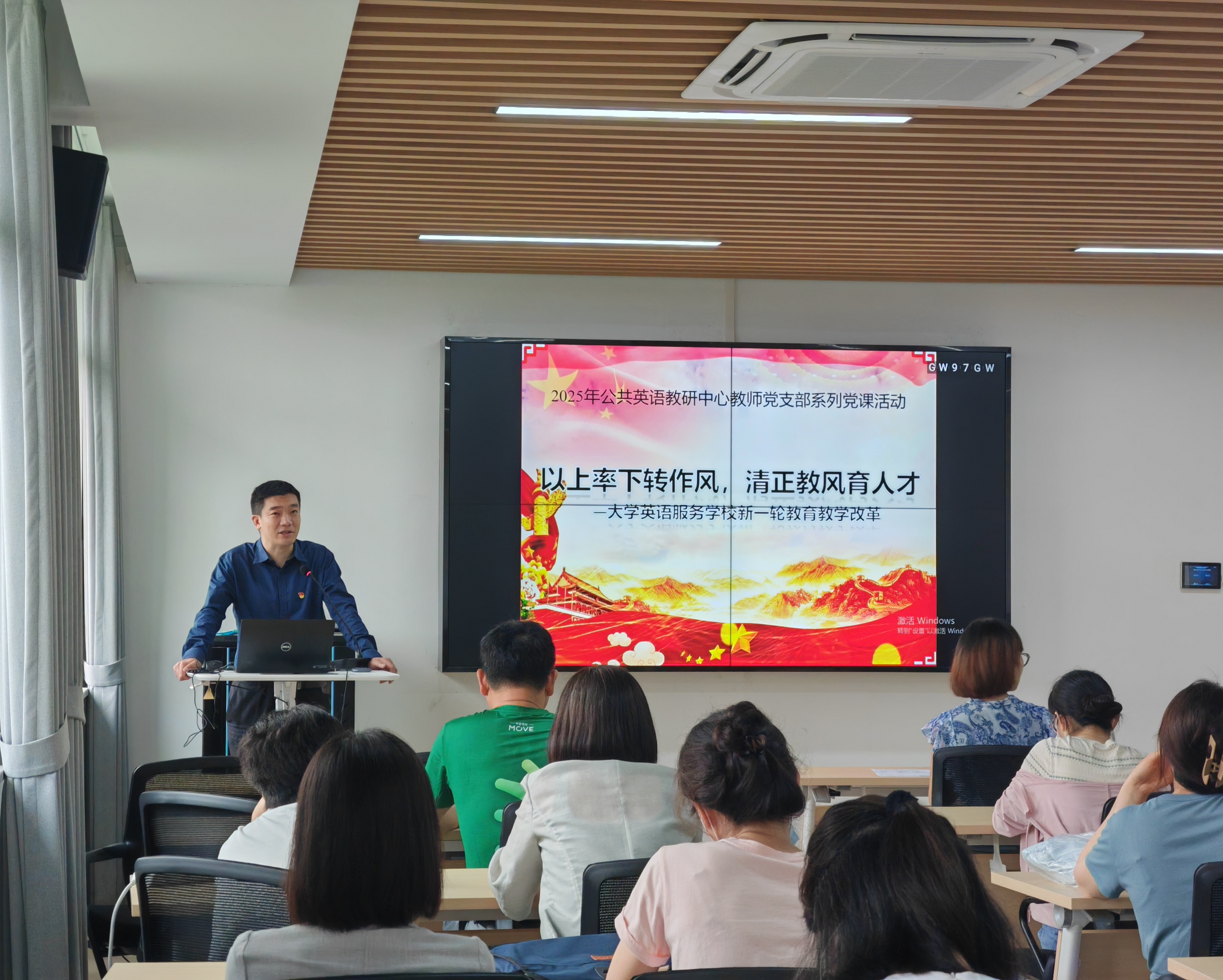6月13日,公共英语教研中心党支部在外语楼502召开全体党员大会。大会由学院党委委员、必赢3003no1线路检测中心副院长张乐为全体支部党员讲授了主题为"以上率下转作风,清正教风育人才"的专题党课。
