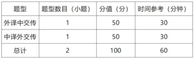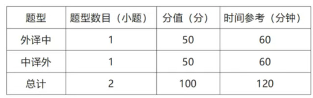 满分为100分,时间为120分钟,共2种题型2道题,全部为主观题。参赛选手可使用中译外、外译中纸质版词典各1本。