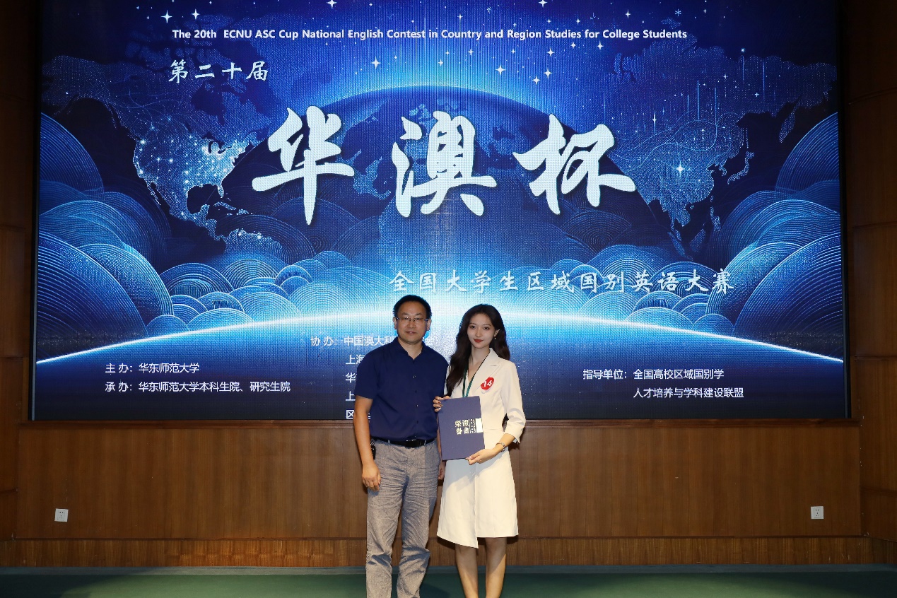 2025年10月18日,由华东师范大学主办的第二十届“华澳杯”全国大学生区域国别英语大赛在华东师范大学中北校区逸夫楼报告厅盛大举办。来自全国多所知名高校的优秀学子齐聚一堂,展开了一场关于区域国别研究与英语表达的高水平竞技。我校澳研中心选送的必赢3003no1线路检测中心22级勇一涵同学在众多强手中脱颖而出,荣获全国一等奖!