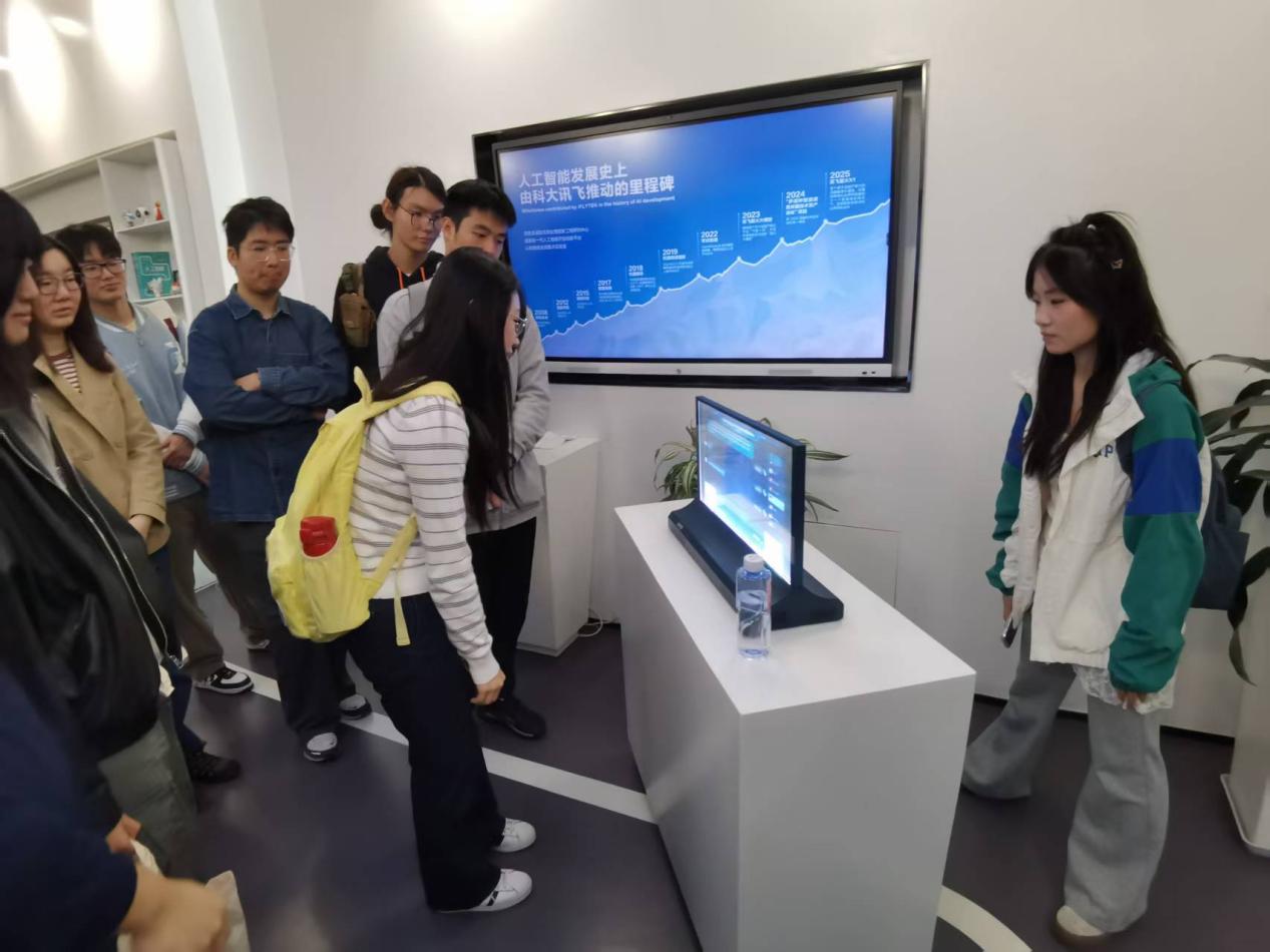 随后,师生们参观了科大讯飞的科技展厅。展厅内,一系列前沿AI产品与应用令人目不暇接:能够实时将中文演讲翻译成多种外语的智能会议系统、用于解决机场、银行、酒店等公共服务窗口跨语言交流问题的多语种AI透明屏、以及在城市治理、医疗、司法等领域深度落地的智能解决方案,都让师生们叹为观止。