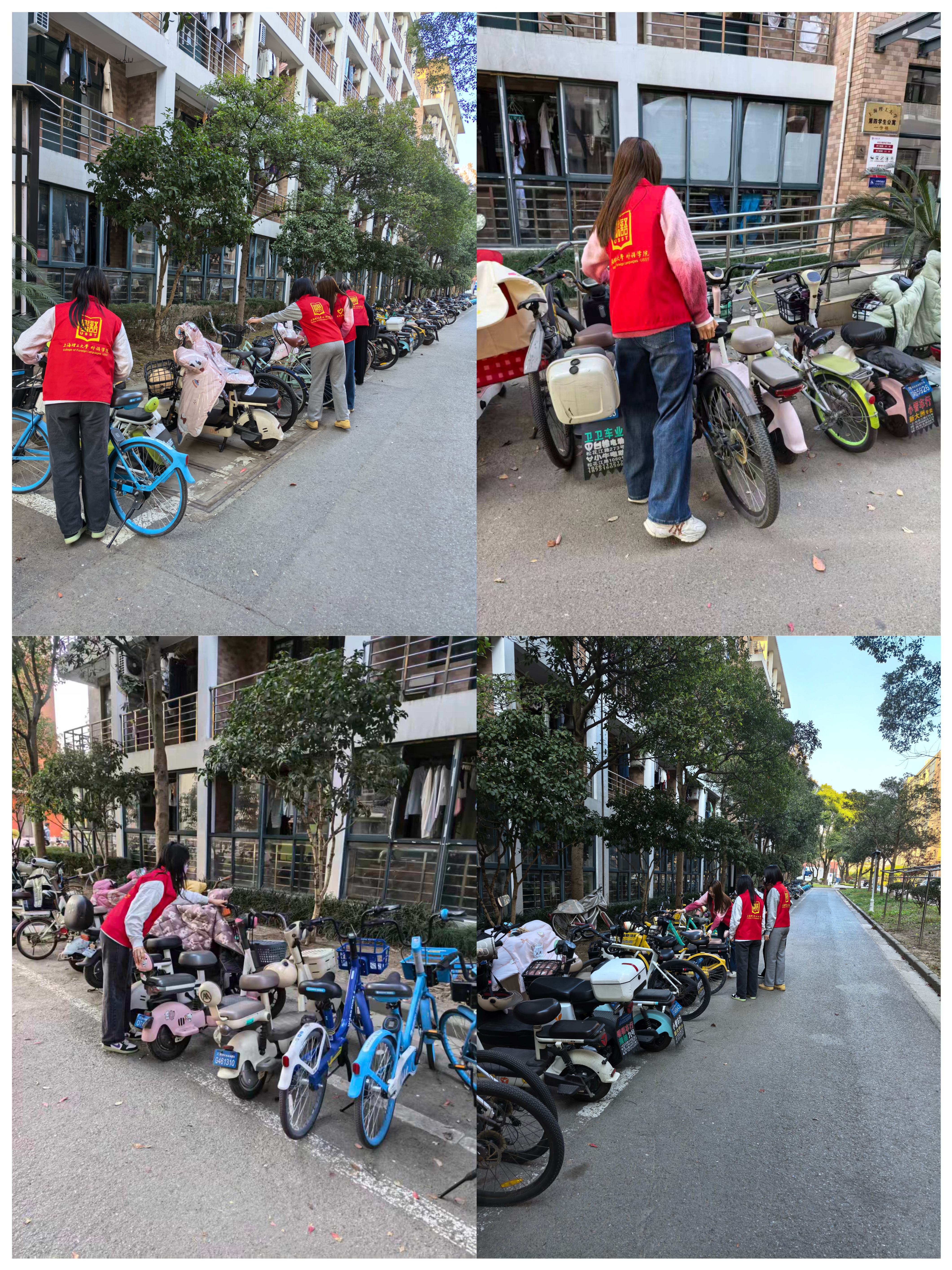 活动当日,志愿者们针对自行车乱停乱放问题迅速行动,分工协作:扶正倾倒车辆、统一车头朝向、清理周边杂物、引导规范停放。尽管冬日寒风凛冽,但同学们热情不减,以细致耐心的态度完成每一辆自行车的整理。经过近两小时的努力,寝室楼周边环境焕然一新,不仅消除了安全隐患,更提升了师生出行便利性。一名路过的学生表示:“以前停车区总是杂乱无章,现在整齐多了,走路也更顺畅了!”