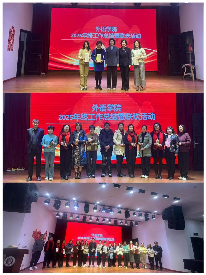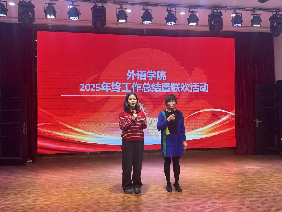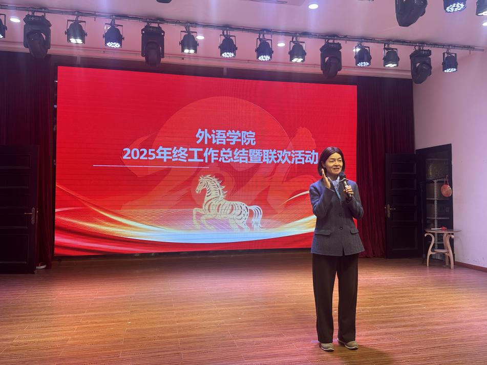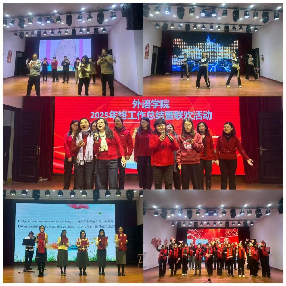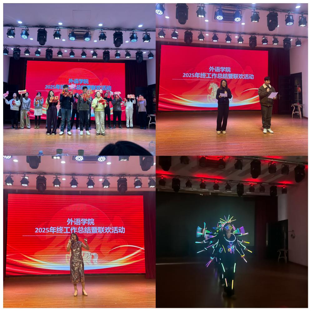 文艺表演环节精彩纷呈,各系部教师热情高涨,积极化身舞台主角,既是导演、又是演员和观众,以歌曲、舞蹈、朗诵、器乐表演等多元艺术形式,将语言专业的细腻感知与艺术表达的炽热激情完美融合,奉献了一台精彩的文艺大餐。办公室工作人员表演的《明天会更好+2026我会一直顺顺顺》、公共英语教研中心教师表演的诗朗诵+歌曲《关山酒》和歌曲《外婆的澎湖湾》、英语(科翻)系教师表演的舞蹈《小天鹅之舞》、日语系教师表演的合唱《樱桃小丸子主题曲》、英语(中美合作)系教师表演的舞蹈《Zoo》和合唱《相亲相爱的一家人》、德语系教师表演的配乐诗朗诵《阶段》,声情并茂,真诚而感人,把联欢活动推向高潮。